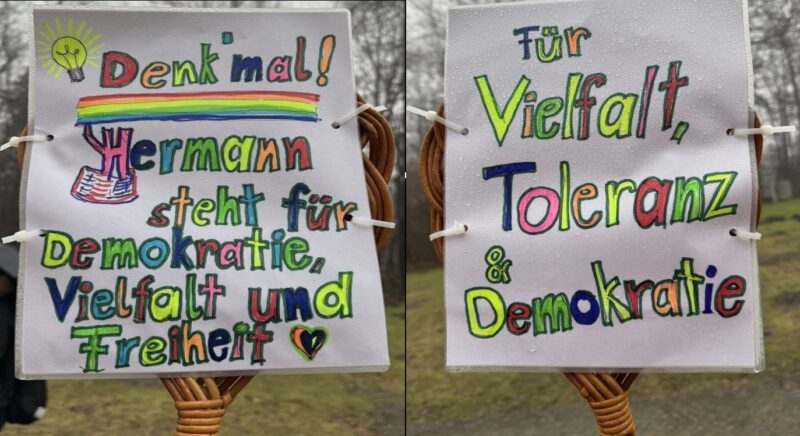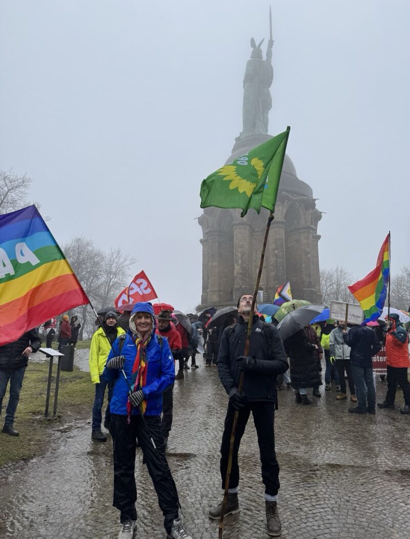 Detmold, den 22. Februar 2026 – Trotz widriger Wetterbedingungen versammelten sich gegen 11 Uhr mehrere Hundert Menschen am Fuße des Denkmals, um ein sichtbares Zeichen gegen die AfD und ihre völkisch-nationalistischen Positionen zu setzen. Unter dem Motto „Detmold bleibt bunt“ zeigten die Teilnehmenden mit Plakaten und Transparenten ihre klare Ablehnung gegenüber rechtspopulistischen Parolen. Die Stimmung war geprägt von Entschlossenheit und gegenseitiger Unterstützung.